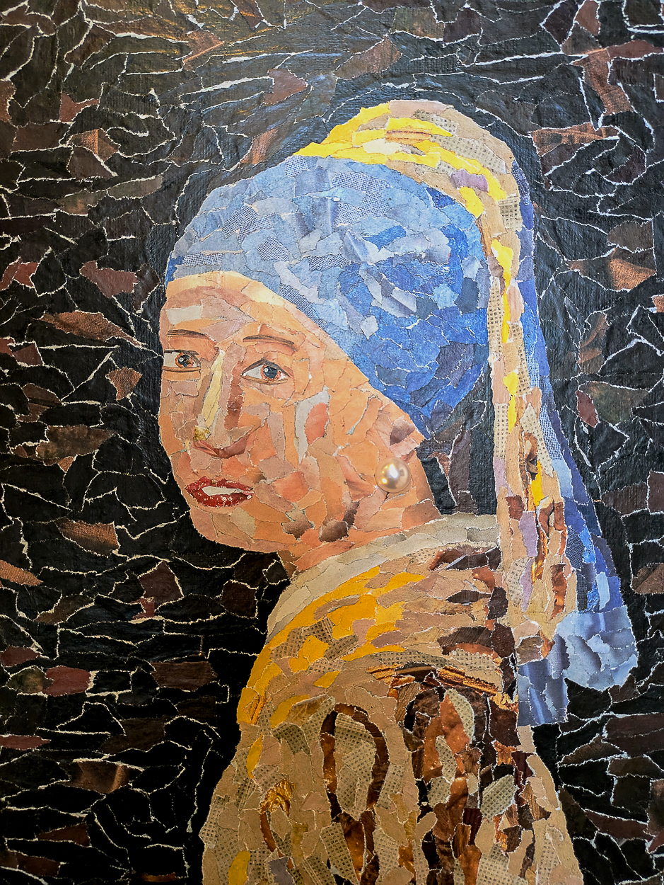 Met gescheurde snippers uit oude magazine heb ik het Meisje met de parel van Johannes Vermeer nieuw leven ingeblazen, met als finishing touch een kleine schitterende parel.