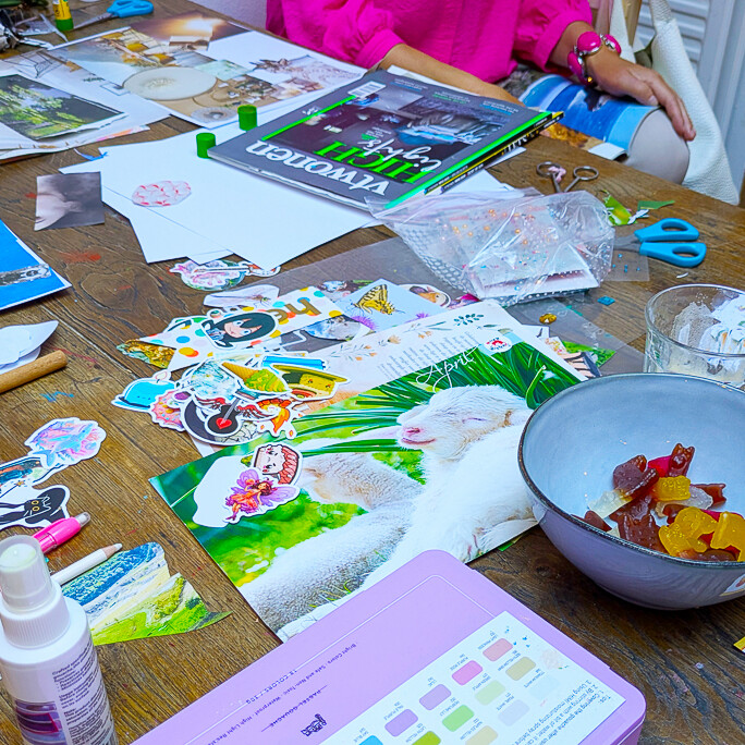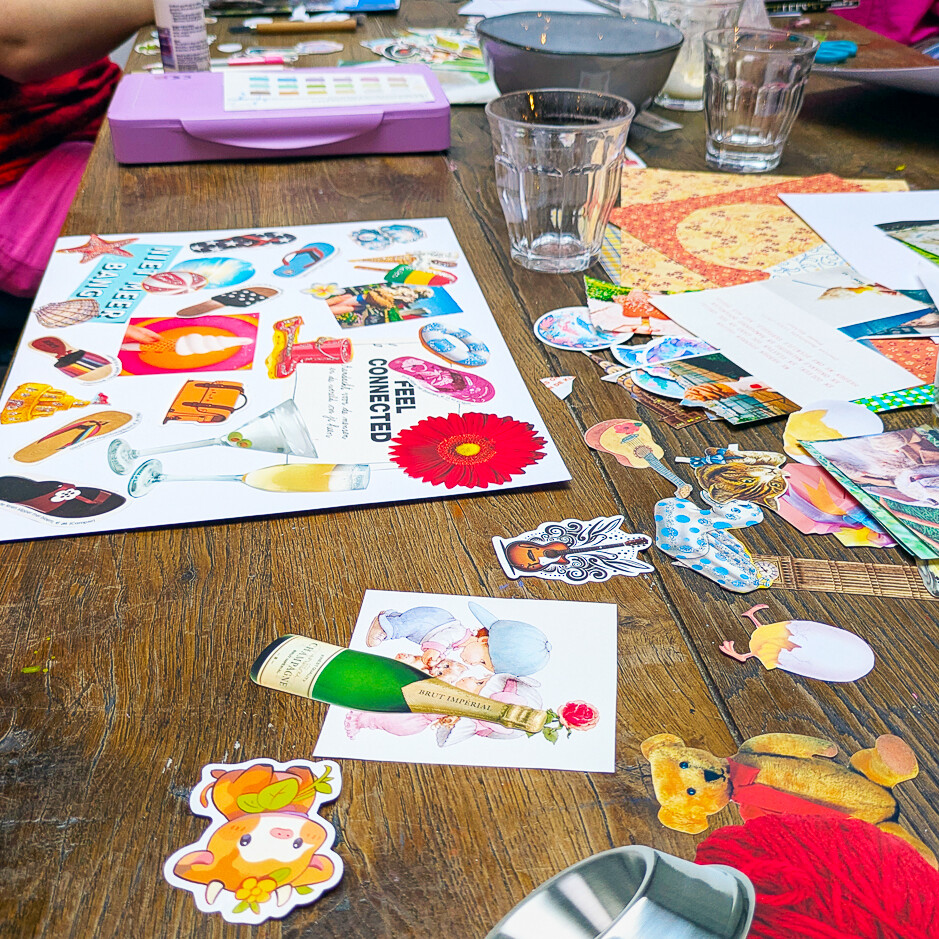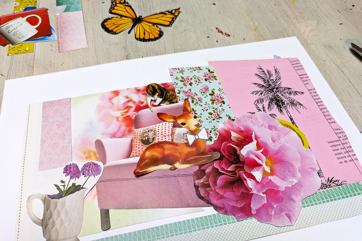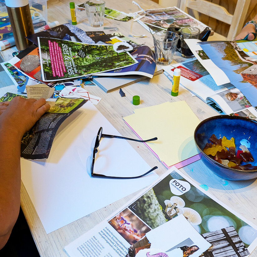 Laat al jouw verwachtingen en negatieve oordelen over wat je wilt maken los en geef jezelf de vrijheid om jouw eigen gevoel te volgen en “woorden” te geven d.m.v. het maken van een collage.